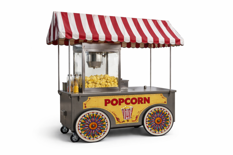 The cart is built for mobility and durability, featuring heavy-duty wheels and integrated storage space for all your supplies. The overhead awning elevates the setup from a simple machine to a full concession experience, offering a professional look that fits seamlessly into both outdoor festivals and indoor grand openings. Fresh, hot, and buttery—there’s nothing like the aroma of popping corn to draw a crowd!