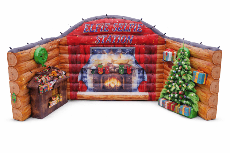 The Elfie Selfie Station is a professional-grade holiday photo op designed for seasonal events and winter festivals. This inflatable station features a detailed festive backdrop with 3D elements, including a fireplace, Christmas tree, and snowy window scene. It serves as a dedicated space for guests to capture themed photos for personal use or social media sharing.